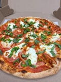 Very light tomato sauce, olive oil, fresh mozzarella cheese, basil, and fresh tomatoes.