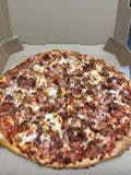 Tomato sauce, mozzarella cheese, pepperoni, Italian sausage, ham, roasted red peppers, and caramelized onion.
